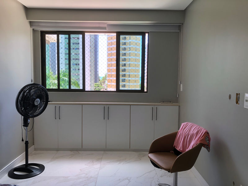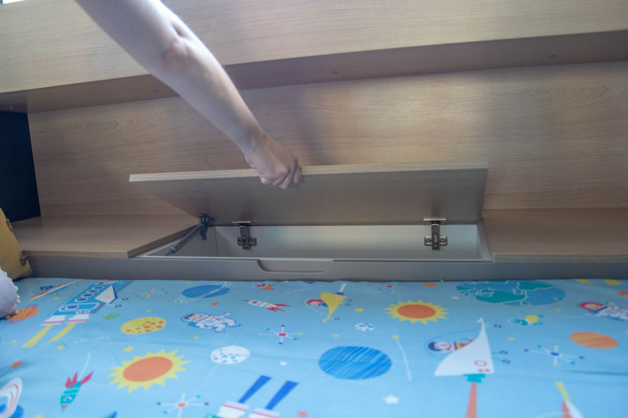 Do lado da cama, aproveitamos o nicho existente da parede para criar um baú, que pudesse guardar todos os brinquedos, mas também servisse de apoio, deixando mais espaço livre para o berço e cadeira de amamentação. O mobiliário solto vai permitir futuramente um espaço livre para brincadeira.