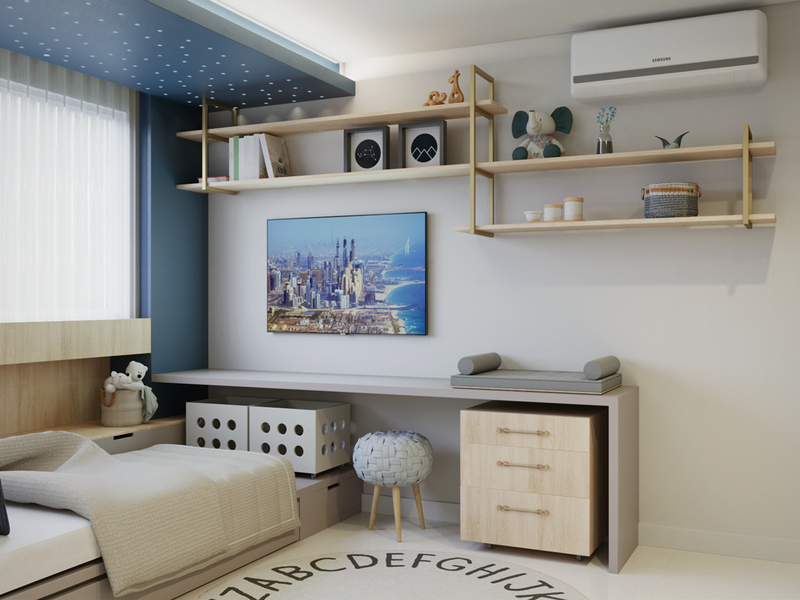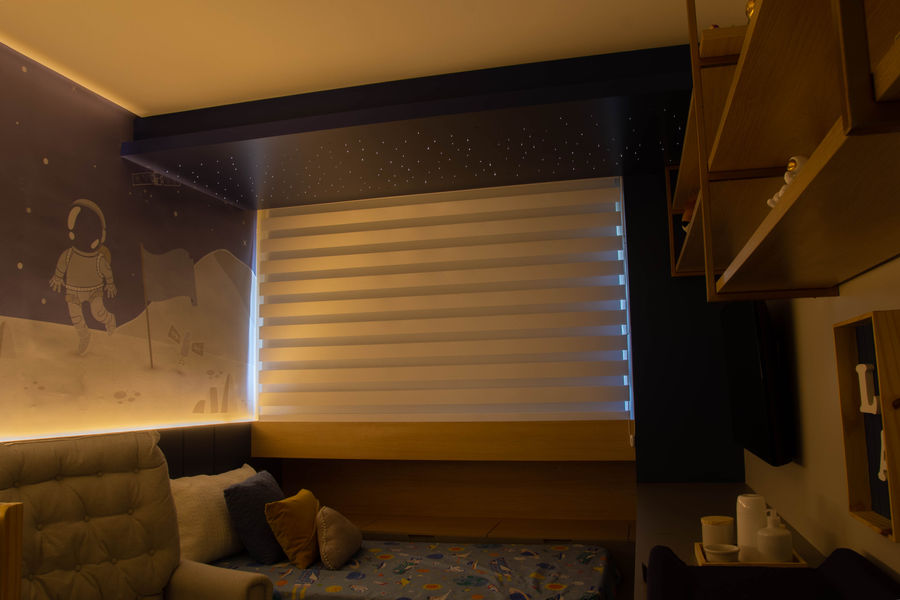 Os pais queriam um ambiente com o tema astronauta, então escolhemos tons de azul para representar essa ideia e apostamos no papel de parede e painel com iluminação de céu estrelado!