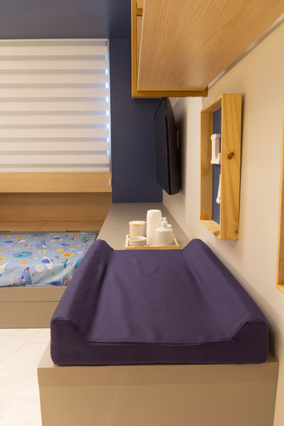 Para que esse espaço pudesse crescer junto com o bebê, desenvolvemos a bancada de forma que sirva atualmente como trocador, com gaveteiro de rodinhas, e depois possa ser usada como mesa de estudos.