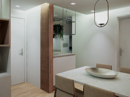 Já na sala de jantar, a cor vibrante da parede segue até o acesso dos quartos, criando uma unidade visual. A bancada em ilha da cozinha serve como ponto de apoio também para a sala, ao mesmo tempo que divide os ambientes.