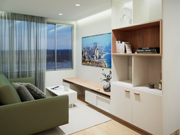 Na sala de estar, optamos por criar com a marcenaria espaço de armazenamento, estantes para decoração e uma mesa de centro que se encaixa na modulação, permitindo liberar o espaço quando não estiver sendo usada.