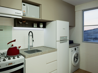 Para a cozinha, bastante compacta, escolhemos tons diferentes nos armários superiores e inferiores, trazendo contraste ao ambiente. Seguindo a mesma proposta, um pequeno apoio para lavanderia.