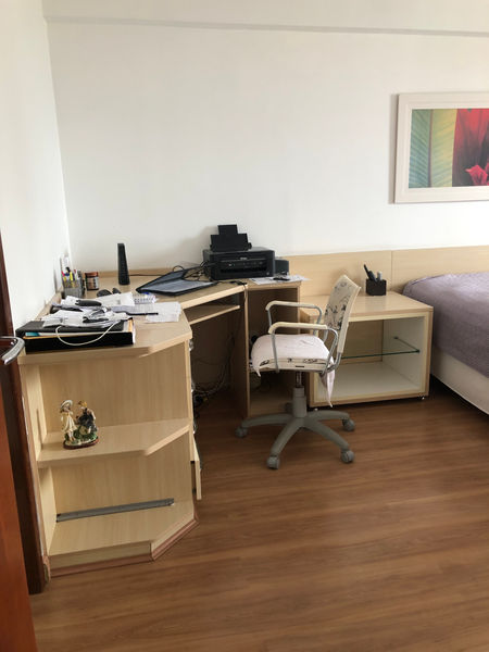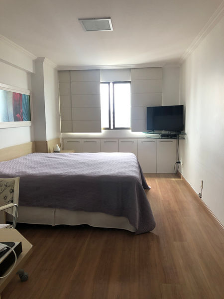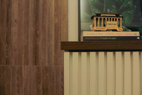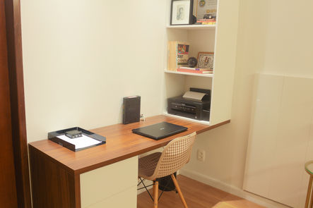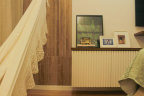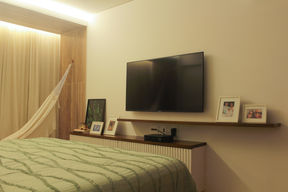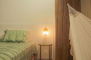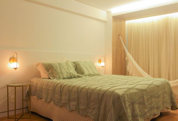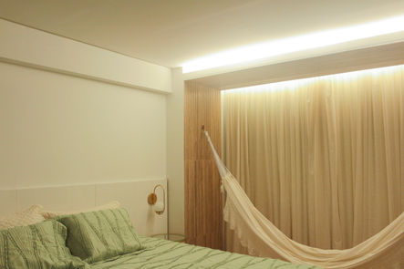 Para trazer um toque de calor e aconchego ao ambiente, optamos por uma cortina longa e revestimento amadeirado, demarcando o espaço da área de descanso, onde fica a rede.