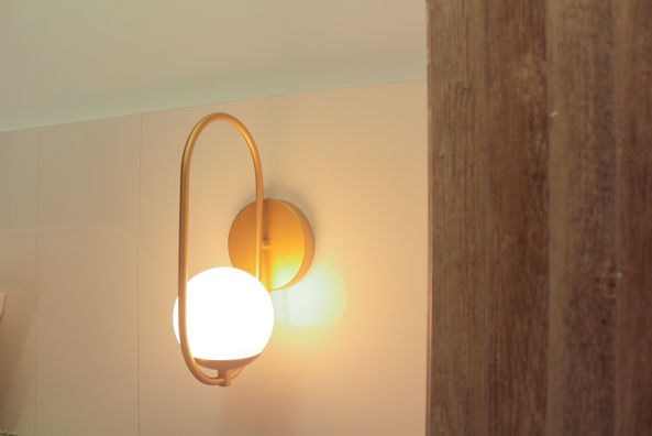 A cabeceira clean e arandela redonda trazem sofisticação para o ambiente, criando um contraste de materiais com o revestimento.
